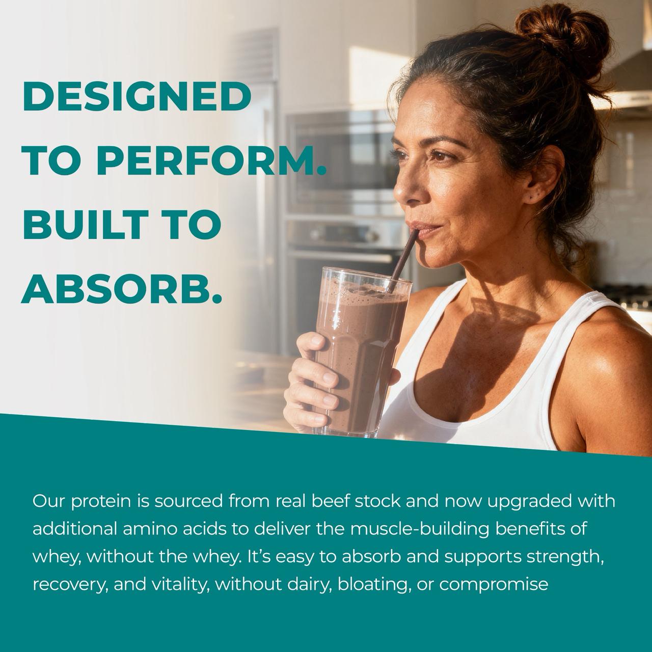 This shake uses bone broth protein peptides (20 g per serving) rather than whey or plant protein, offering a highly digestible amino acid profile that supports lean muscle, recovery, joint comfort, gut health, and skin quality without dairy or common allergens.