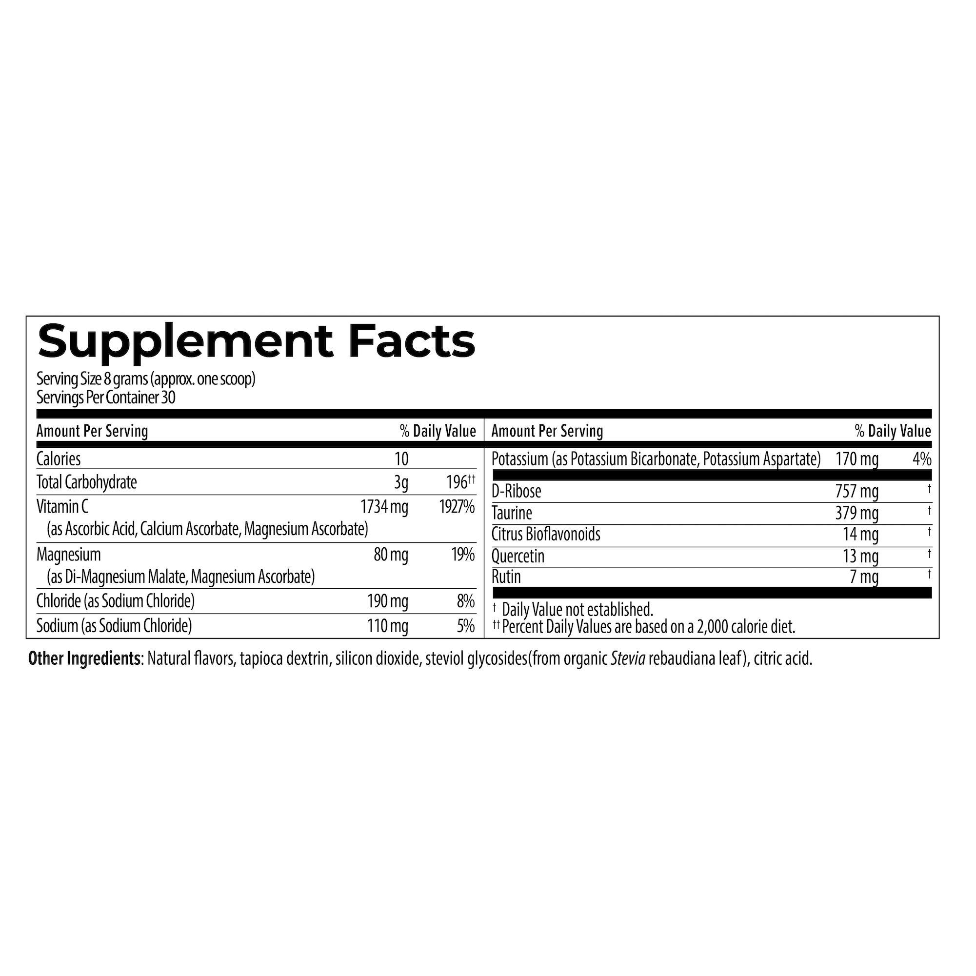 Taurine is an amino acid that regulates the flow of electrolytes in and out of the cells. L-ribose supports post-exercise recovery and energy levels.
