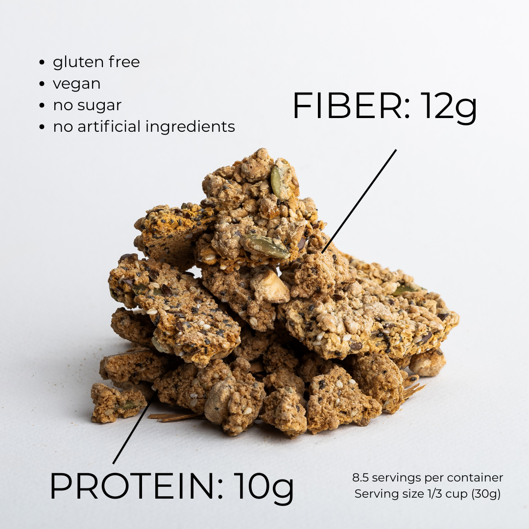 Most granola is higher in sugar and calories and lower in protein. This one is designed to be more balanced and more satisfying. Each serving has 10 g of protein, 12 g of fiber, and only 100 calories.