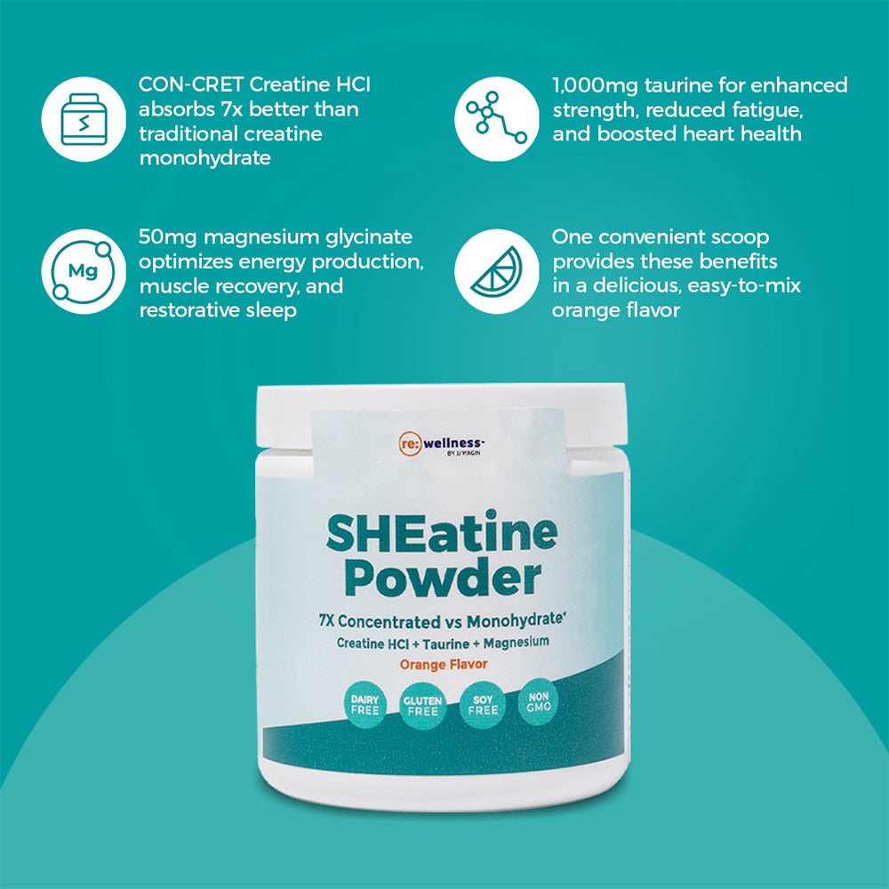 SHEatine™ capsules and powder each offer unique benefits to suit your lifestyle. Capsules provide pre-measured doses for quick, convenient use—perfect for busy days or travel. The powder offers more flexibility, easily blending into smoothies or beverages for a customized experience, in a great-tasting orange flavor that’s naturally sweetened with stevia. No matter which option you choose, you’ll enjoy the same potent blend of CON-CRĒT® Creatine HCl, magnesium glycinate, and taurine.